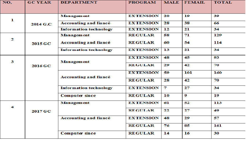 NO, GC YEAR DEPARTMENT PROGRAM MALE FEMAIL TOTAL 1 2014 G.C Management EXTENSION 20 19 39 Accounting and fiancé EXTENSION 28 38 66 Information technology EXTENSION 12...